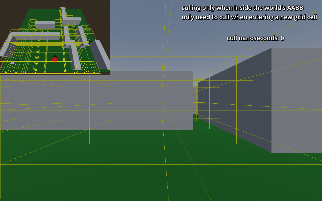 the yellow boxes represent grid cells which are computed as visible from the grid cell the camera is currently in.
